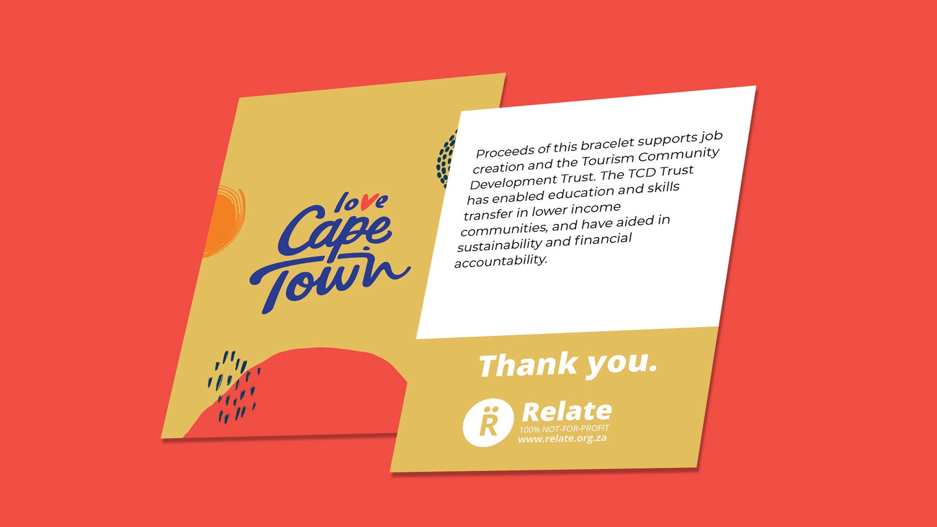 During my time at Relate Trust, I collaborated with Love Cape Town on the design of a packaging insert card featured on the front of their product packaging. The brief required the design to closely align with the organisation’s established corporate identity. Working within these parameters, I developed a solution that respected Love Cape Town’s brand values and visual language while translating them clearly into a physical, customer-facing touchpoint. The final outcome maintained brand consistency while enhancing the overall packaging experience. relate.org.za